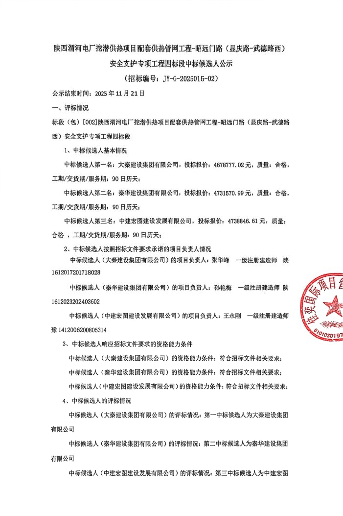 保标招标 > 供热管网 > 中标信息 > 陕西渭河电厂挖潜供热项目配套供热管网工程-昭远门路(显庆路-武德路西)安全支护专项工程四标段中标候选人公示